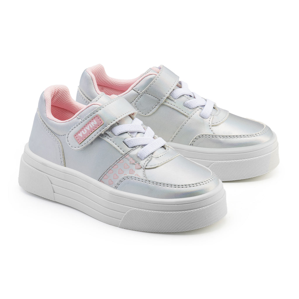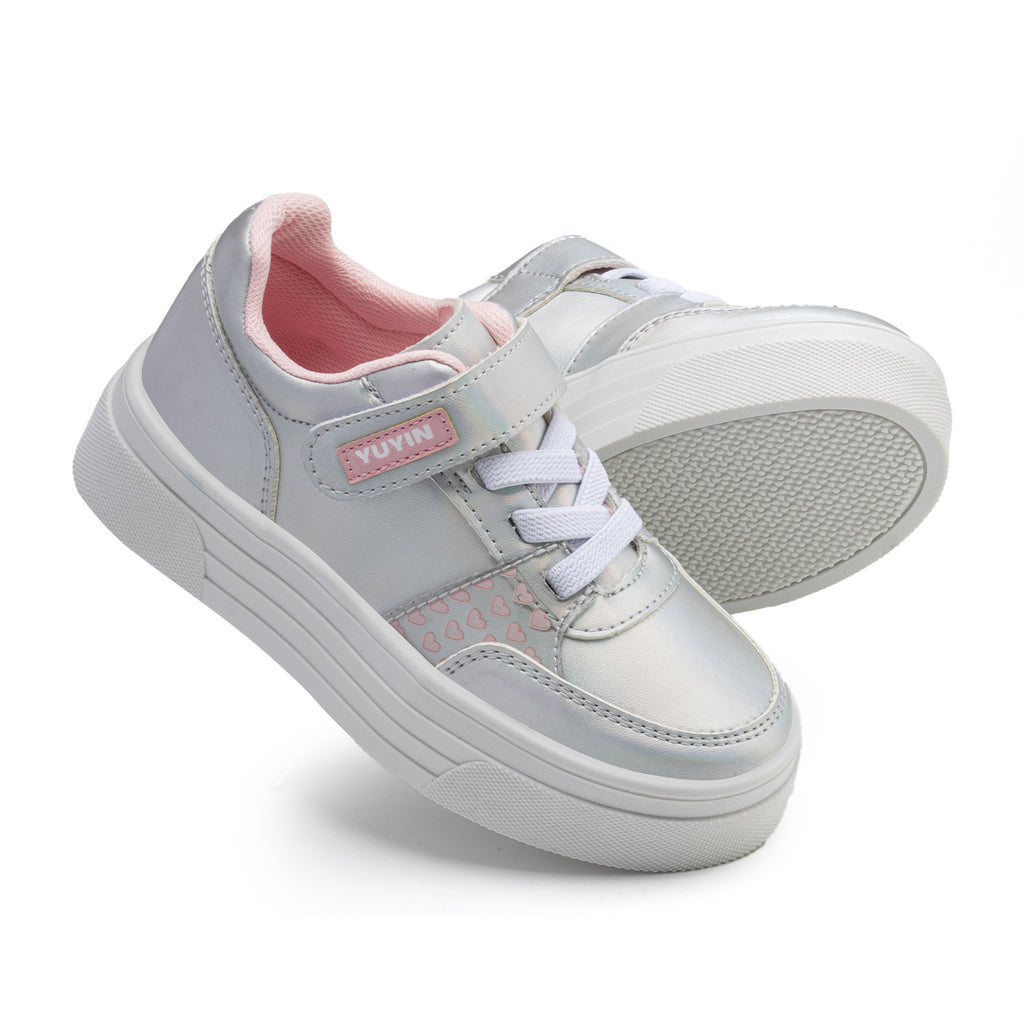 ¡Haz que cada paso de tu pequeña brille con estilo con estos adorables tenis Yuyin! Con un diseño moderno y femenino en tonos metálicos y detalles de corazones rosas, estos tenis son perfectos para destacar en cualquier ocasión.