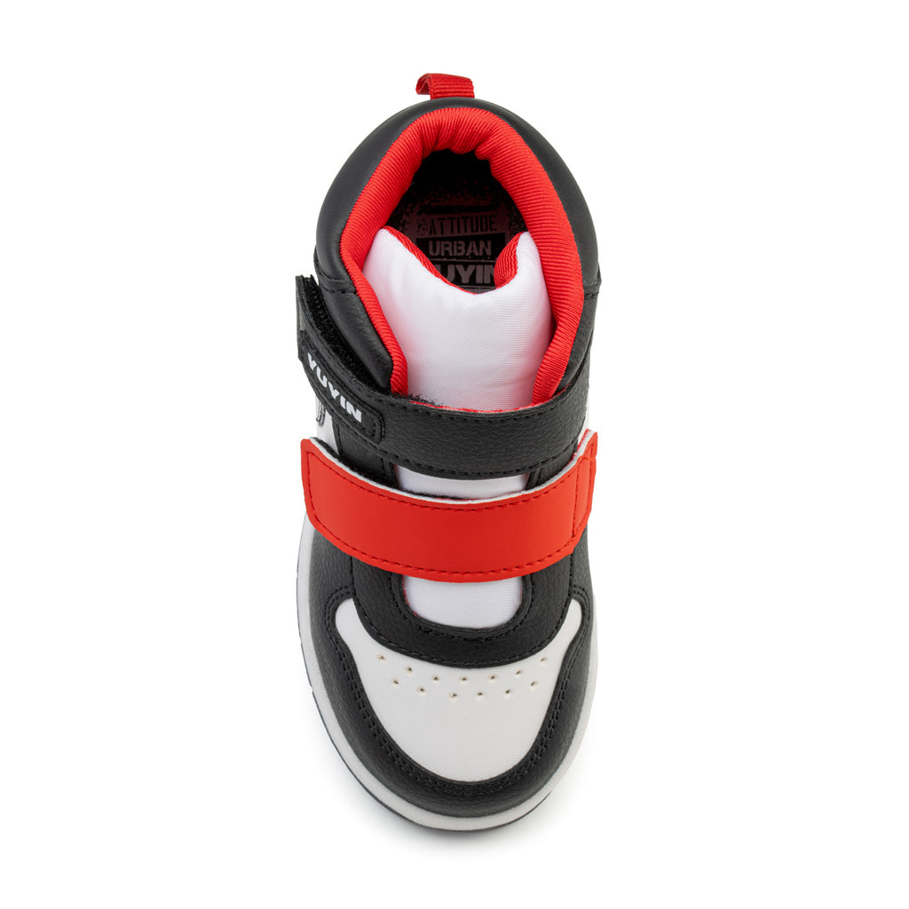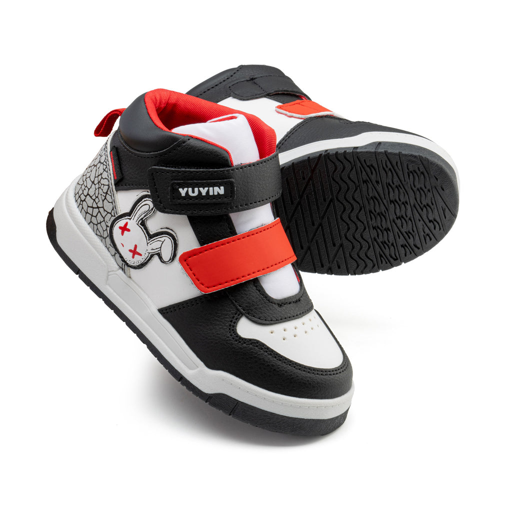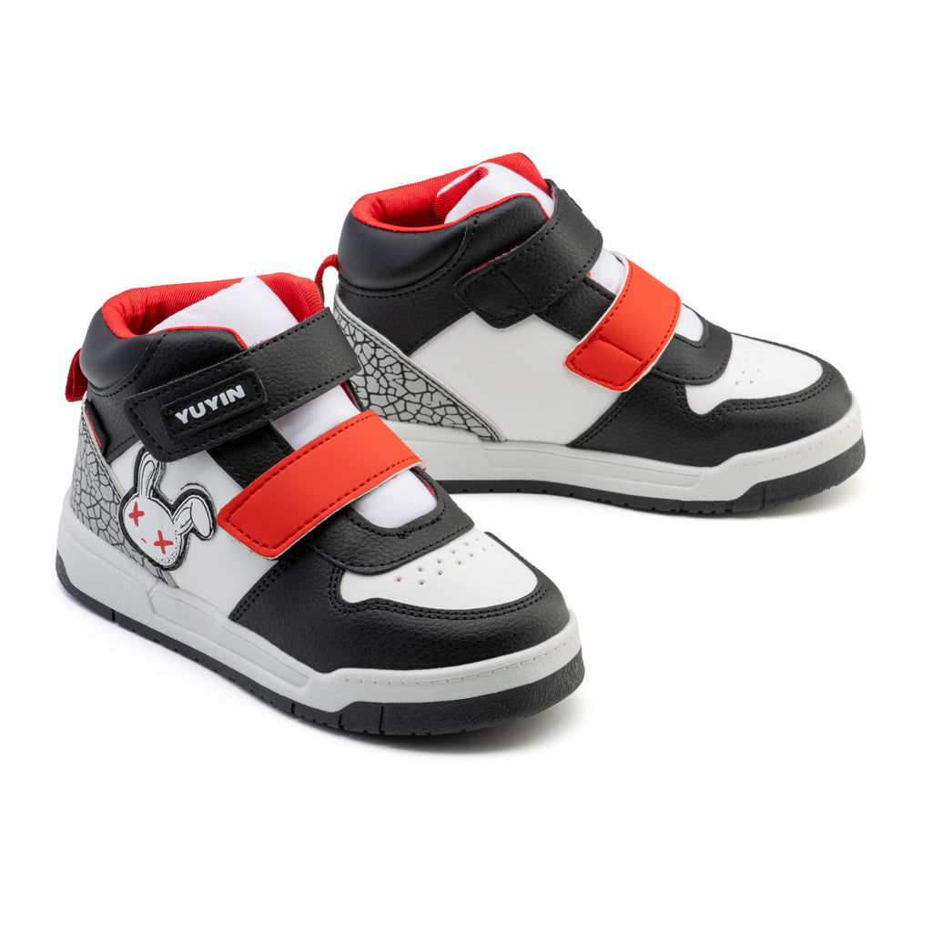 Esta bota de Yuyin lo tiene todo: una silueta tipo sneaker de corte medio que combina a la perfección los tonos negro, blanco y rojo, con un bordado gráfico de conejito que le da toda la personalidad.